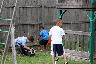 The kids were very excited to wake up and find their hidden Easter baskets. We did a fun game of 'warmer-colder' to help lead them in the right direction. Gavin found his in the shower while that sneaky Easter bunny hid Harrison's on top the arcade games inside of a small tent.